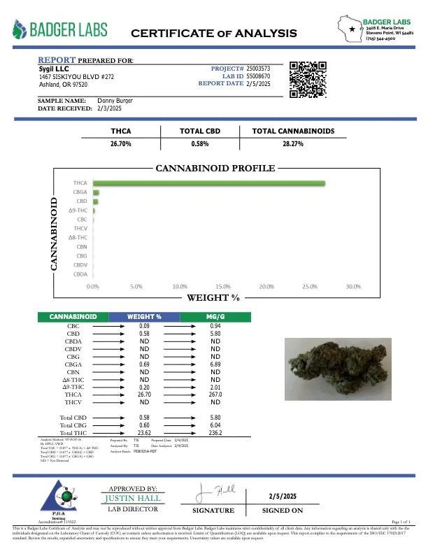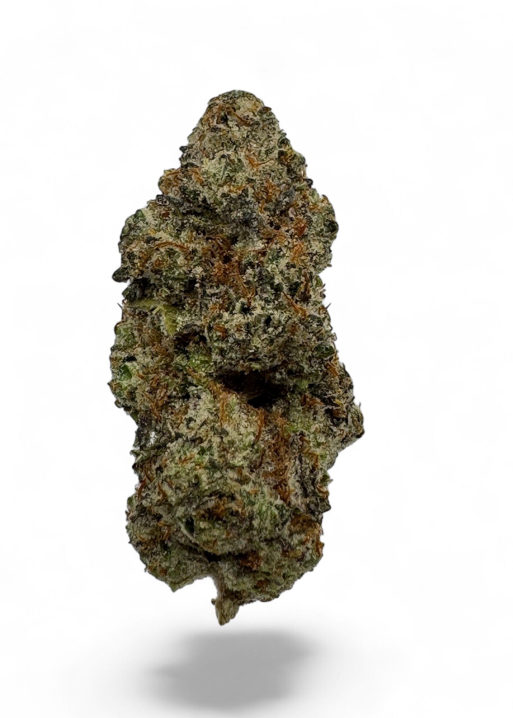 DONNY BURGER is a heavy indica hybrid strain created through crossing GMO and Han Solo Burger. Donny Burger operates a lot like a sativa but can still deliver an immediate body high that boosts the mind and relaxes the body at the same time. Liked by social smokers and/or those looking to dive into a solo journey of creative exploration. Donny Burger indoor flower has an average of 30% THCa, making the effects of Donny Burger immediately felt and long lasting. This bud has a spicy and peppery garlic flavor with pungent aroma of spicy savory overtones. Donny Burger buds have a purple hue to their greenness with tremendous bag appeal. A favorite of new and old smokers alike.