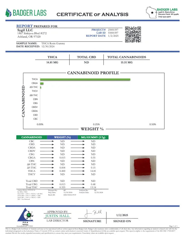 Glucose, sugar, fruit pectin, citric acid, THCA rosin, sodium bicarbonate, natural flavor, coconut oil, food coloring.