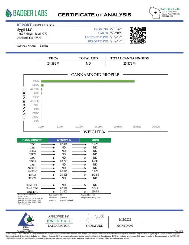 Zkittlez is a flavor-packed indica-dominant hybrid born from the legendary Grape Ape x Grapefruit cross. A multiple Cannabis Cup winner, Zkittlez has earned its reputation through an irresistible blend of sweet tropical flavor, mellow euphoria, and full-body relaxation that leaves you smiling long after the session ends. The high begins with a gentle cerebral uplift, brightening mood and boosting creativity without overstimulation. As the effects deepen, a calming body buzz rolls in, soothing away tension and promoting easygoing comfort while keeping you alert and engaged. On the comedown, Zkittlez eases you into a serene, dreamy state without heavy sedation — ideal for winding down at the end of the day. Each bud bursts with candy-like sweetness, offering vibrant notes of berry, citrus, and tropical fruit with hints of earth and herbs underneath. The aroma mirrors the taste — fruity and rich with a light herbal edge that rounds out the experience. With its balanced effects and mood-lifting nature, Zkittlez is a go-to strain for easing stress, anxiety, and mild pain, or simply enjoying a flavorful, feel-good high that lives up to its candy-inspired name.